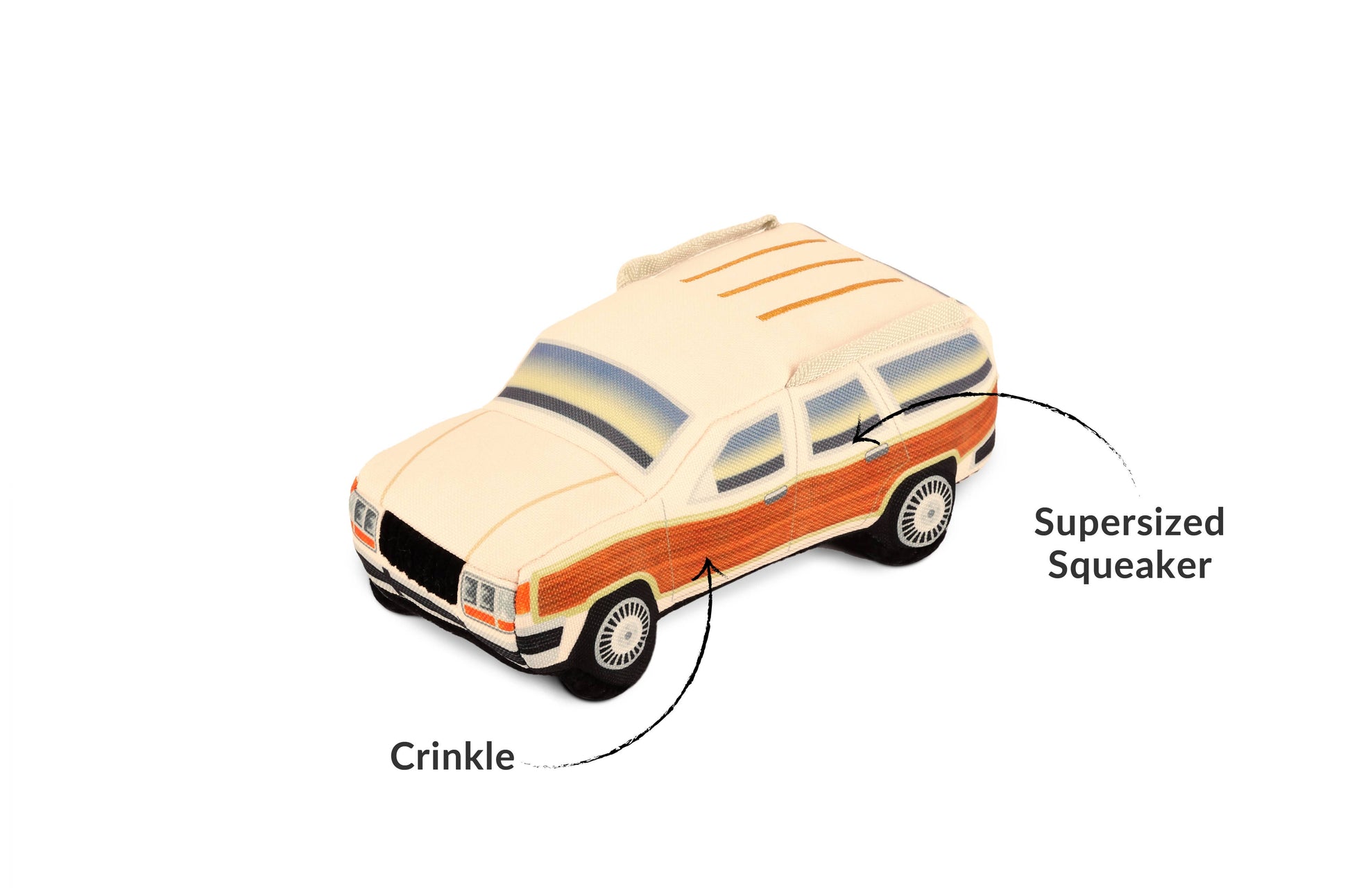 Hit the road in retro style with P.L.A.Y.'s 80s Classics Scruffy's Station Waggin' toy – a tail-wagging adventure waiting to happen! This station wagon features a super-sized squeaker in the body for maximum excitement and crinkle fabric for a playful texture. Watch your furry friend cruise into playtime with this nostalgic toy crafted for a canine journey! •Hand-made craftsmanship, double layer exterior and reinforced stitching for extra durability •Eco-friendly PlanetFill® filler is made from 100% post-consumer certified-safe recycled plastic bottles •Machine washable and dryer friendly