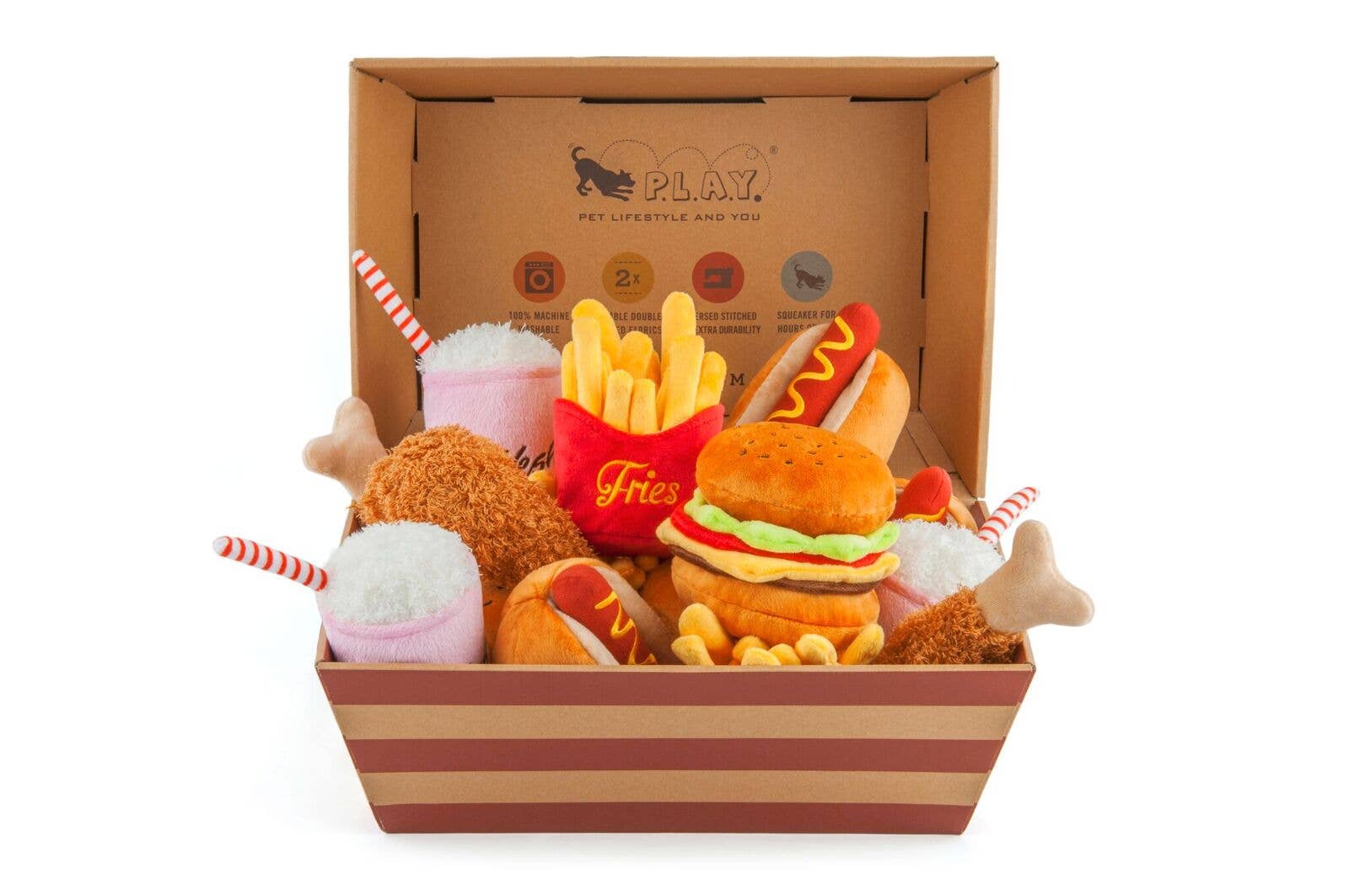 The American Classic plush toy collection by P.L.A.Y. is for the foodie in your life! Who doesn't enjoy a scrumdiddlyumptious nom once in a while? Say goodbye to your Paleo diet and indulge your pup in the good ol' juicy burger, drumstick, and hot dog with a side of fries. Wash all that greasy goodness down with a milkshake!