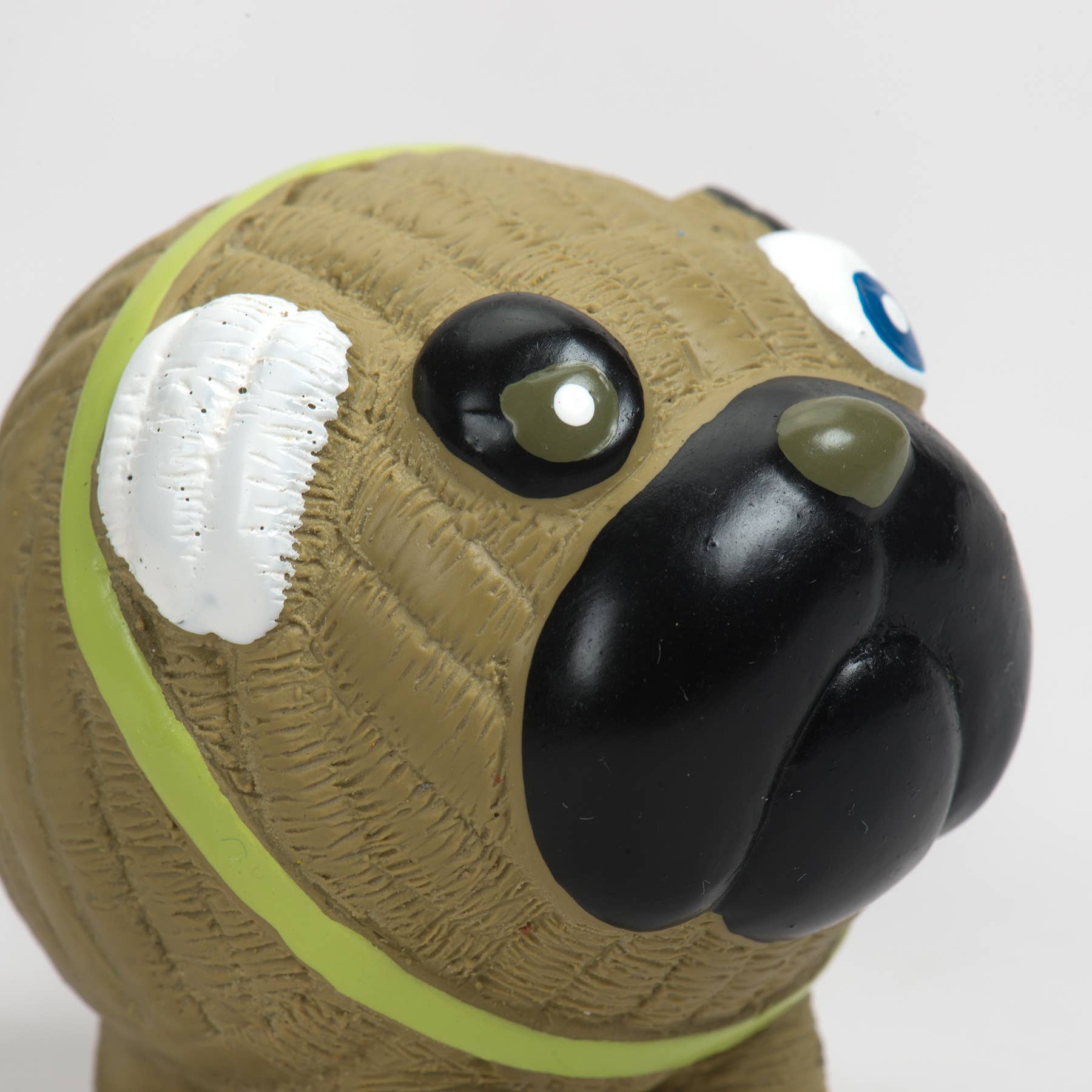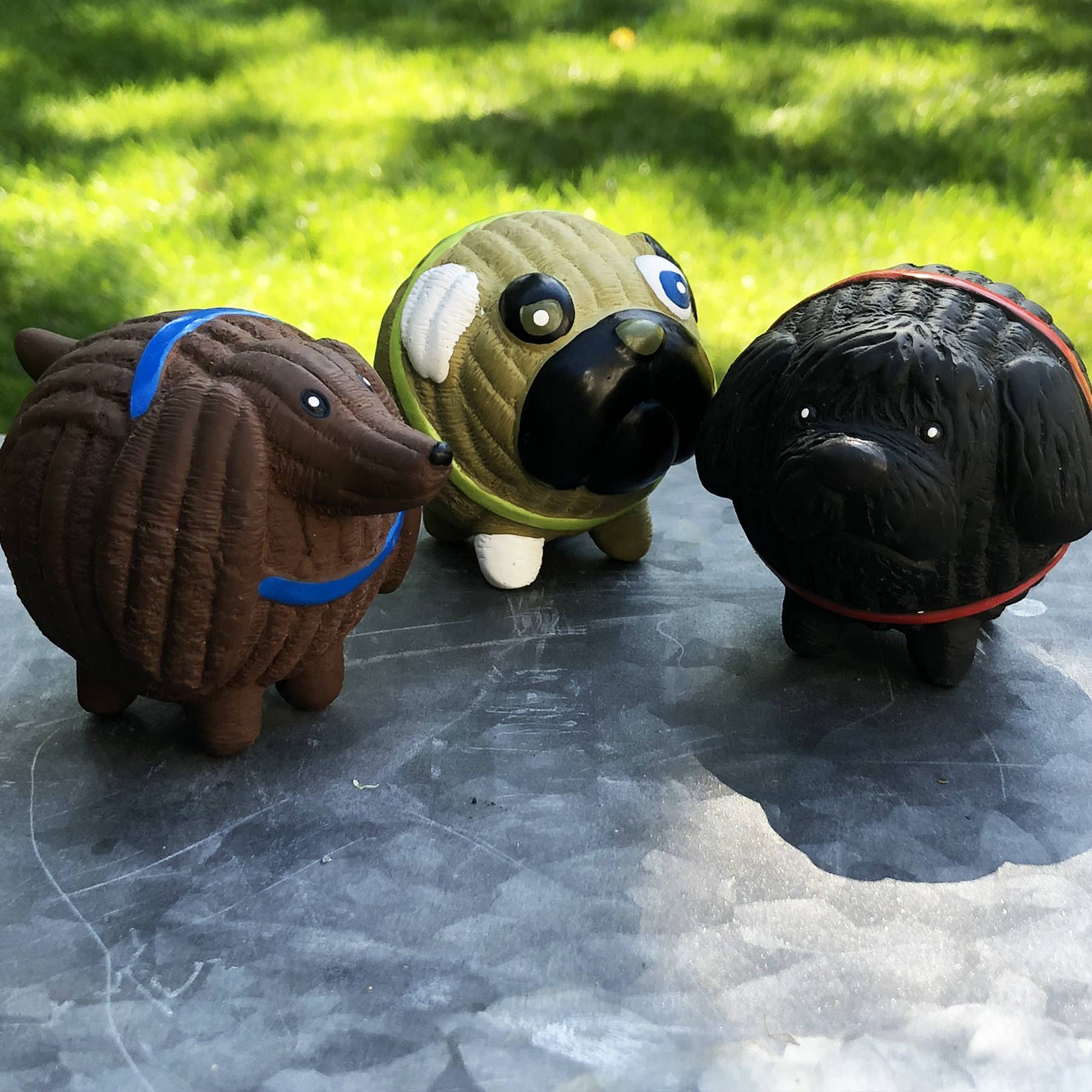 These small HuggleMutt™ balls measure about 3" x 3.5" x 3" and are made from tough, natural, non-toxic rubber latex that resists tears and stretches strong. Each ball is hand-painted with child-safe paints and filled with soft PU foam and a fun squeaker inside. They’re perfect for bouncing, stretching, squeezing, and even floating during playtime!