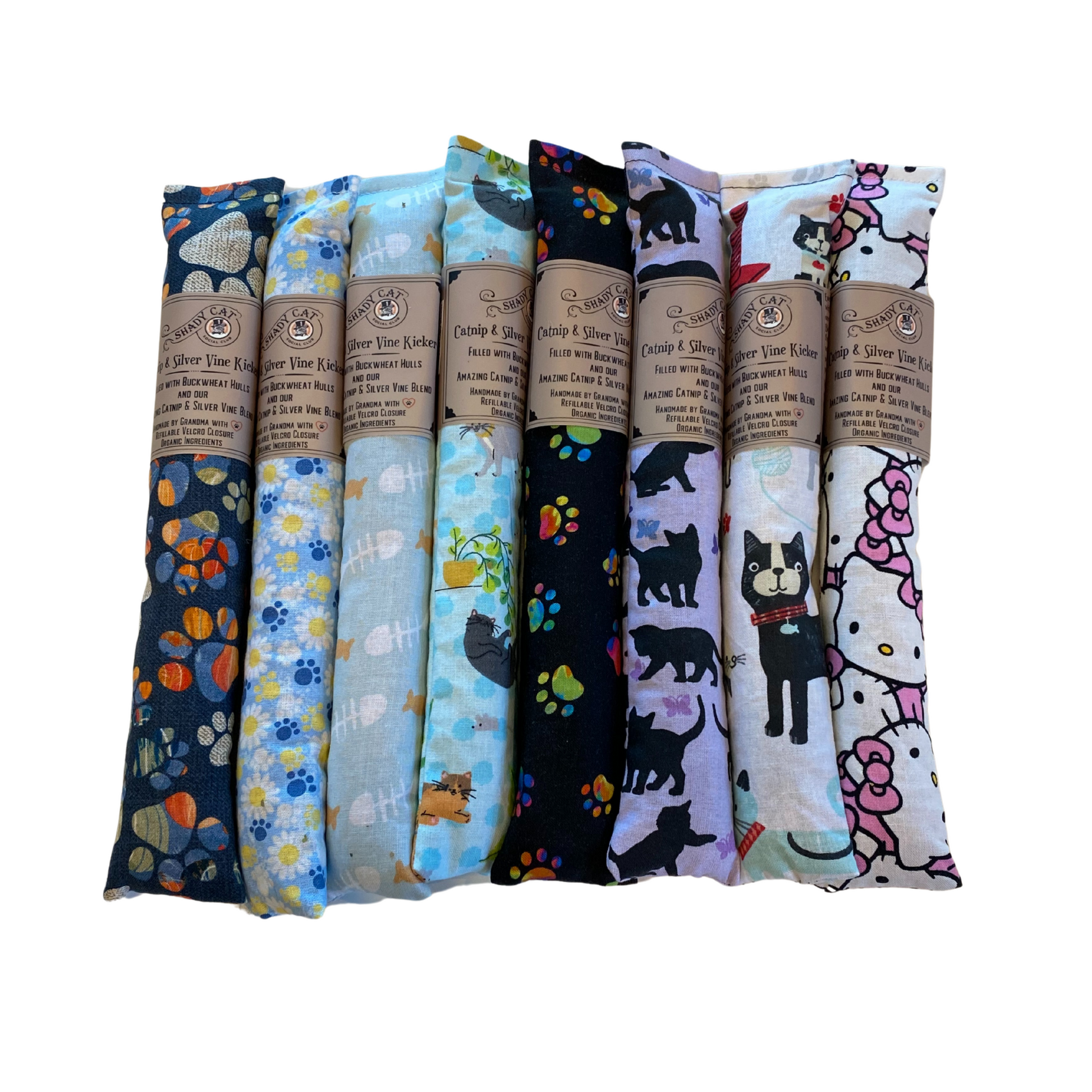 Hand sewn adorable Kicker Cat Toy filled with eco friendly buckwheat hulls to give a crinkly crunch your cat will love to play with!