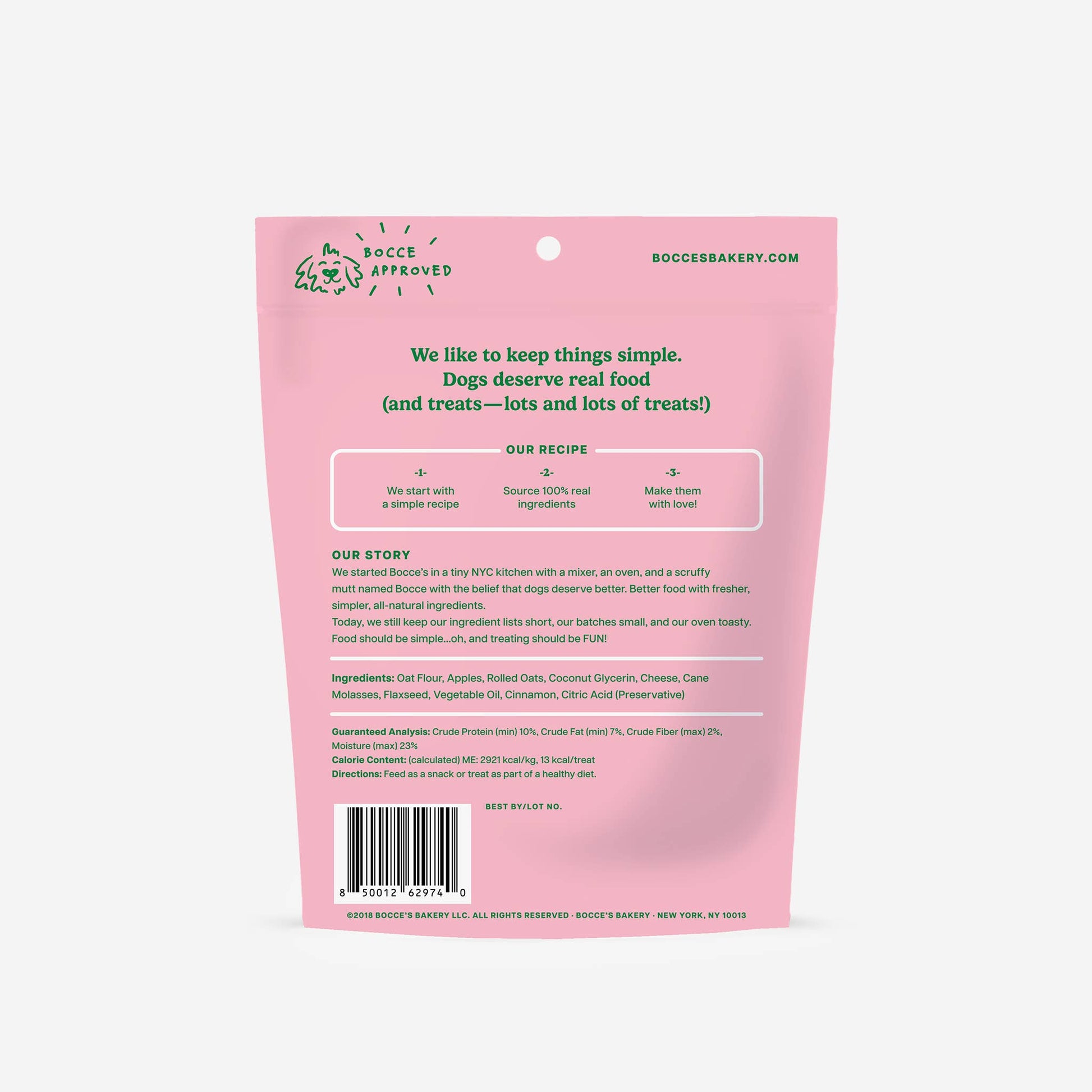 Ingredients: Oat Flour, Apples, Rolled Oats, Coconut Glycerin, Cheese, Molasses, Flaxseed, Vegetable Oil, Cinnamon, Citric Acid (Preservative)