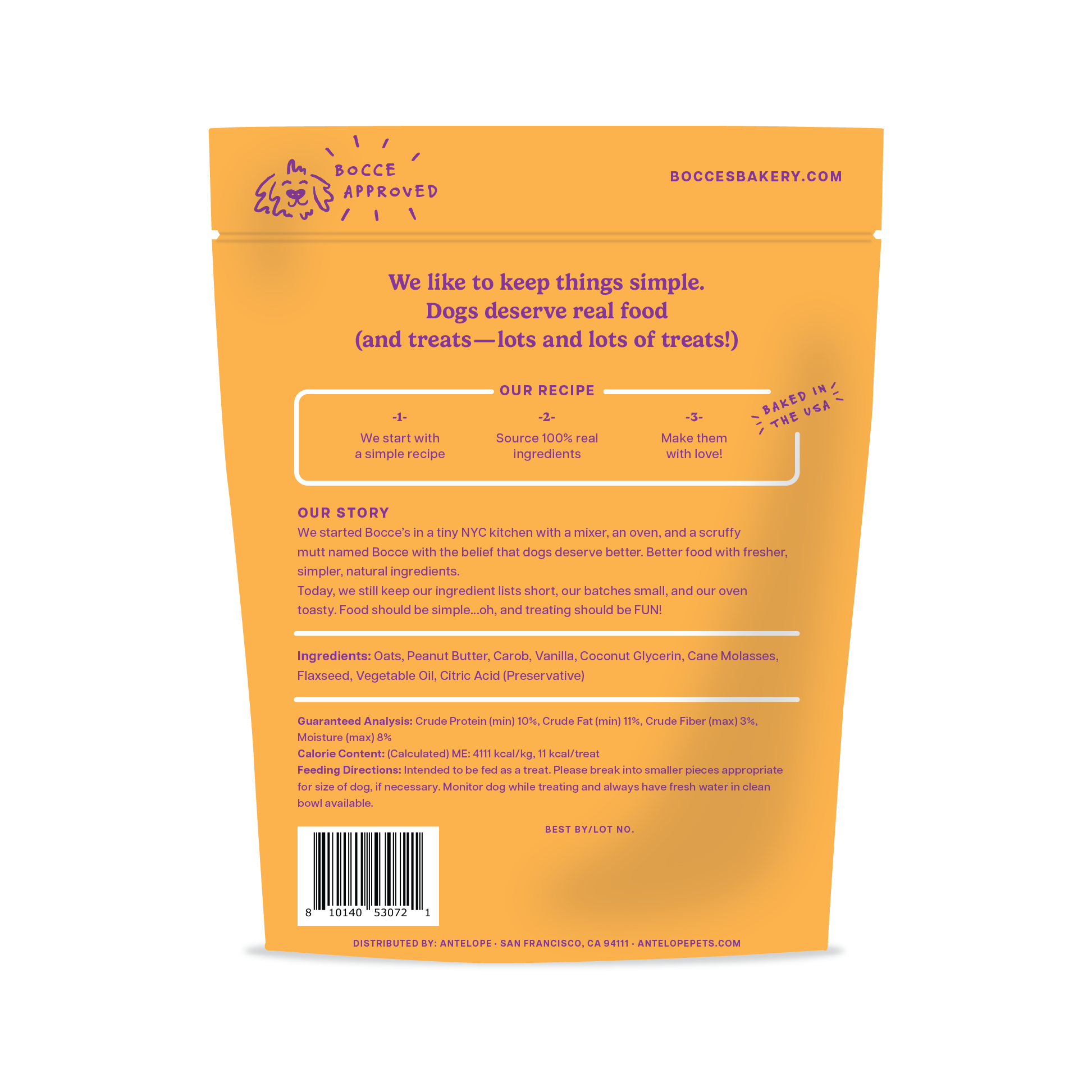 Ingredients: Oats, Peanut Butter, Carob, Vanilla, Coconut Glycerin, Cane Molasses, Flaxseed, Vegetable Oil, Citric Acid (Preservative)