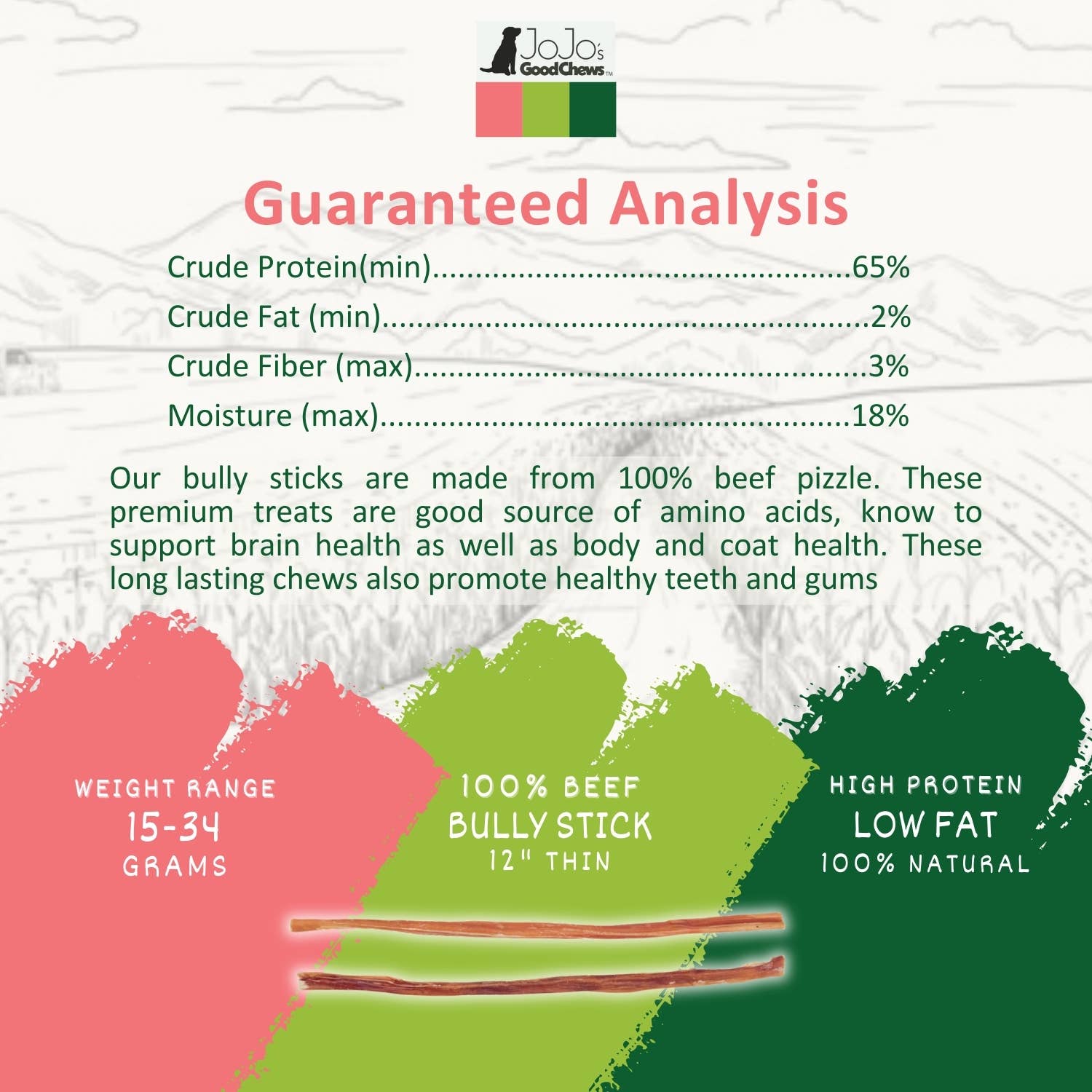 Natural Beef Bully Sticks for Dogs - 12" Thin (25/Bag)