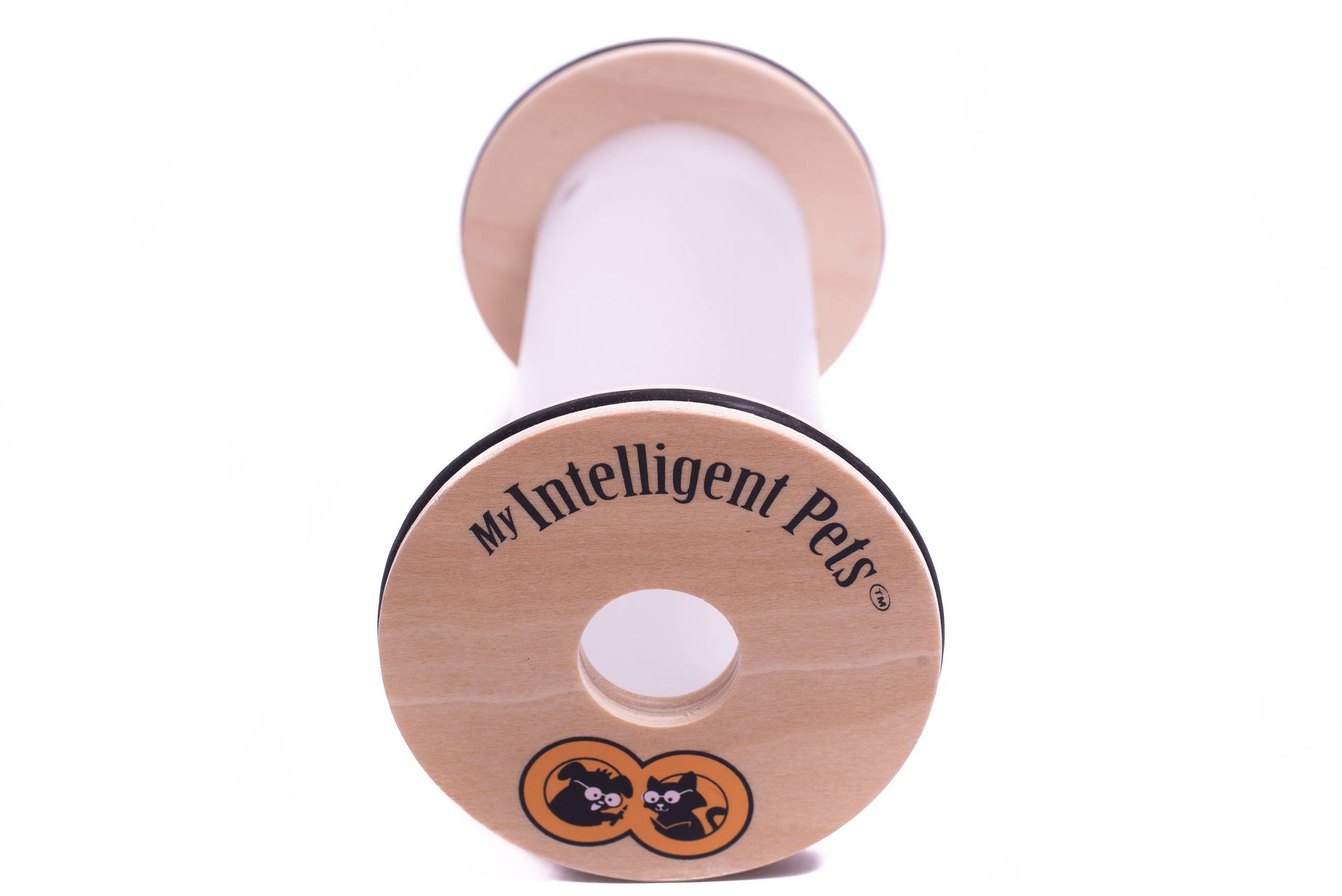 It is a relatively easy game with 1 paw difficulty level on our scale. It contains a transparent cylinder where you insert your dog's favorite treats. The challenge is to make the treats fall out through 3 openings in the cylinder by rolling it on a flat surface. This game is designed for small and medium breeds.