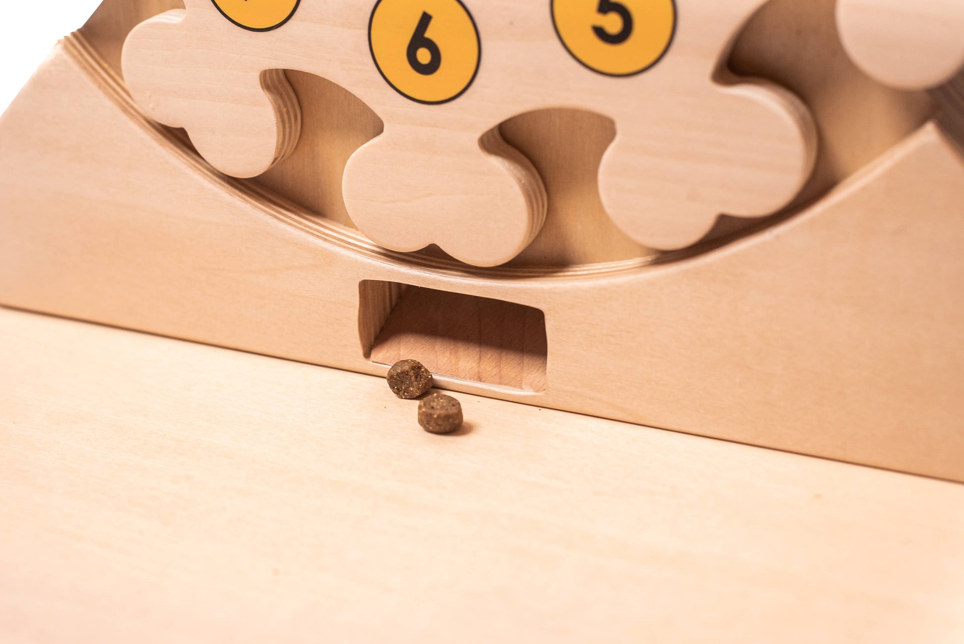 Pet's O'Clock is an innovative puzzle for pets (especially dogs and cats) made from wood. It requires the skill of moving the Clock's plate in one direction (clockwise) in order to get treats. The move of the Clock's plate is always possible by 1 hour. The Clock's plate is fixed on a base with screws included in the package.