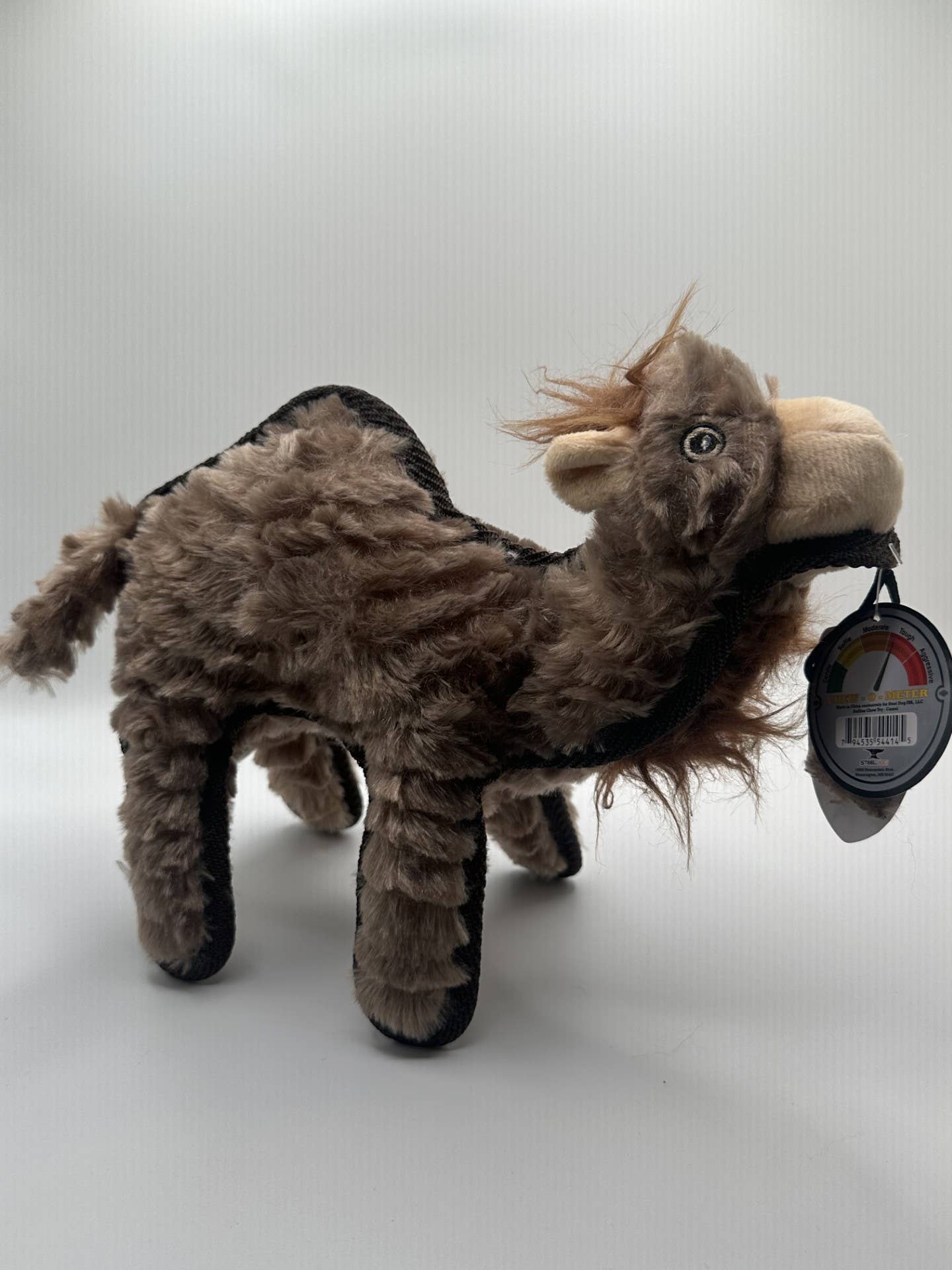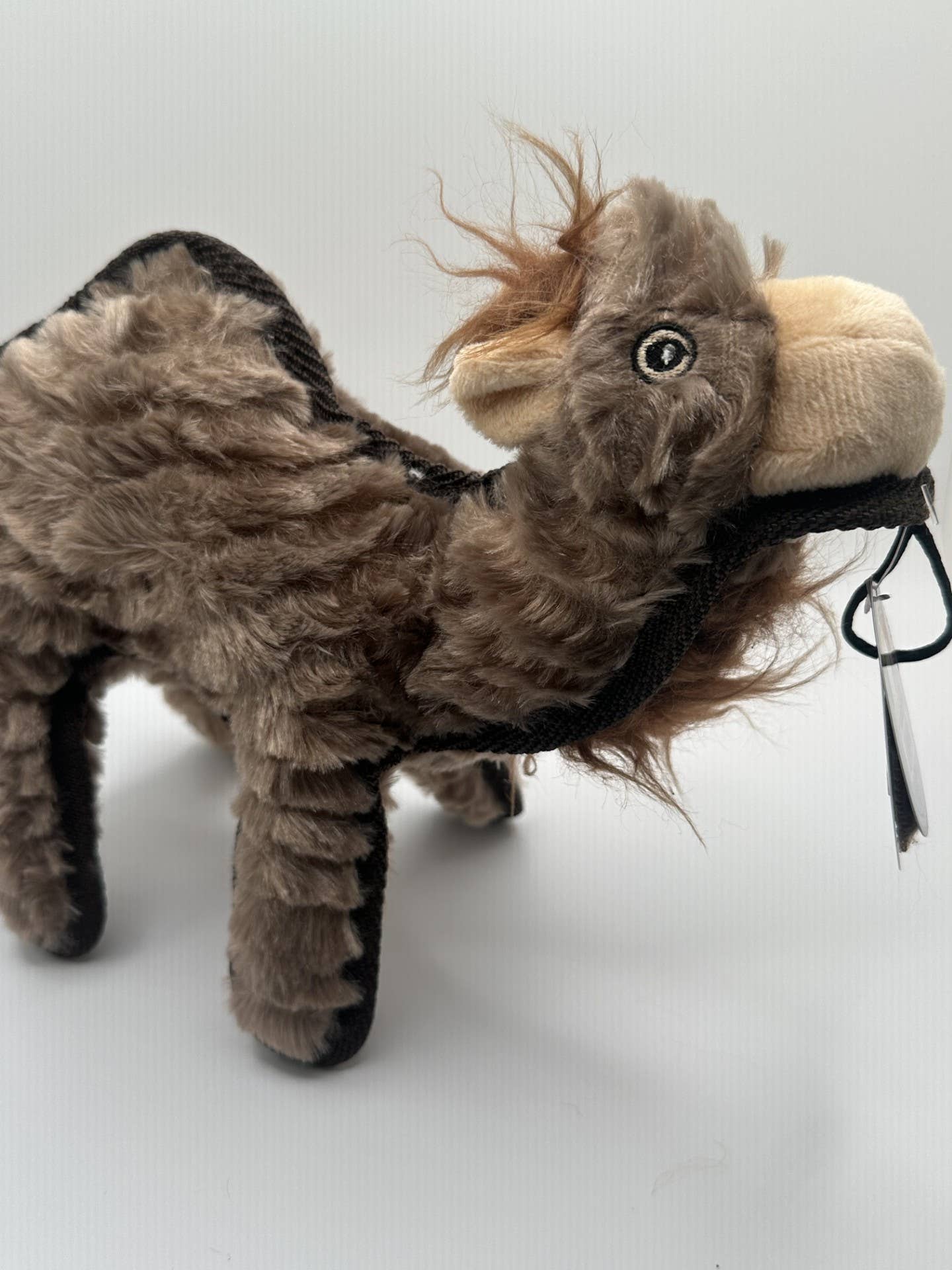 This soft-textured Ruffian Hoofer Camel, not only comes with a tennis ball, crinkle, and squeaker inside but also comes equipped with a STEEL SHIELD. The shield provides an extremely durable lining so your dog really has to work to sink their teeth into this one! Ruffians have a Tough Chew-o-Meter rating. Even if they do succeed in tearing through the seams, there is a tennis ball toy waiting inside—two toys for the price of one!
