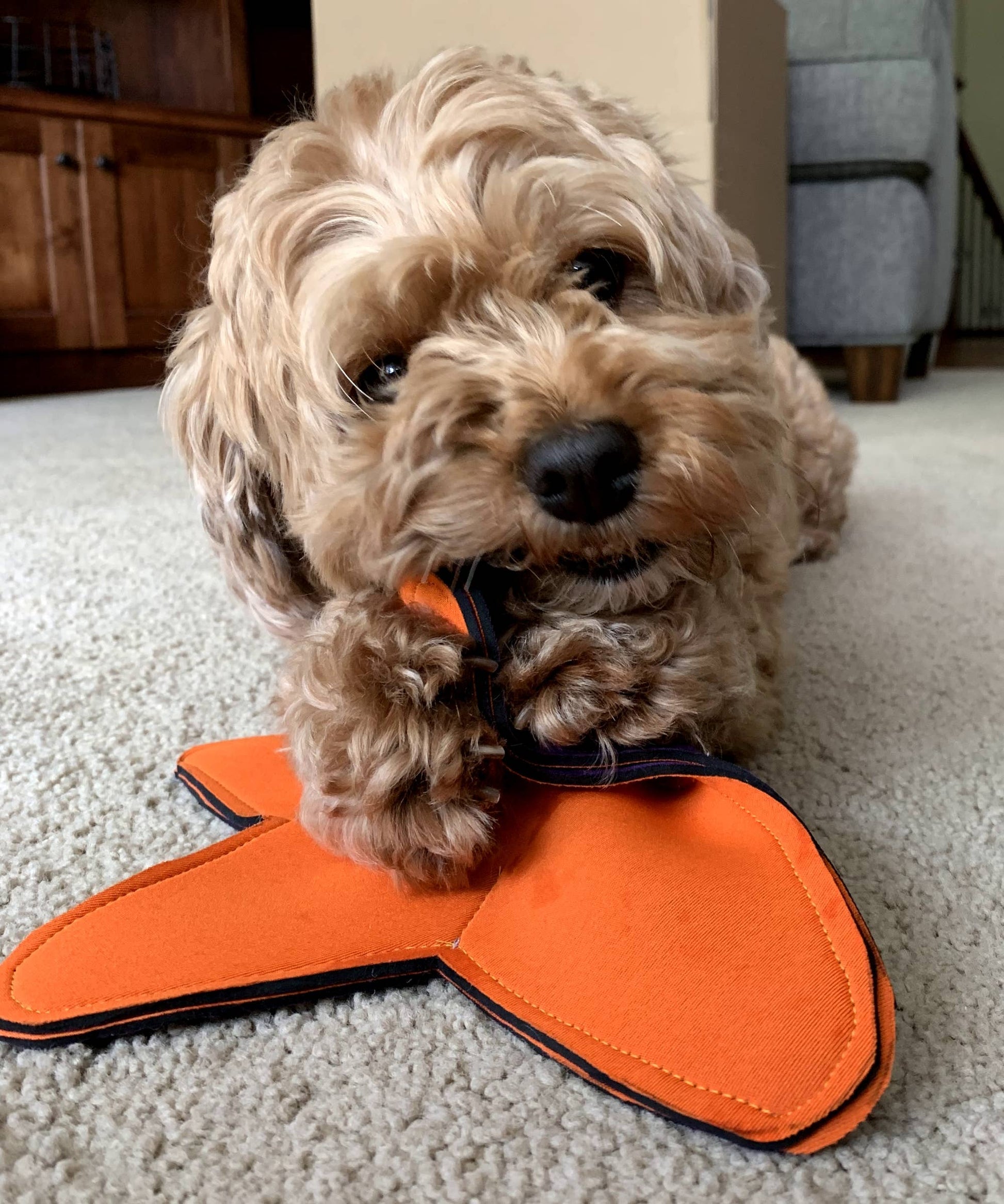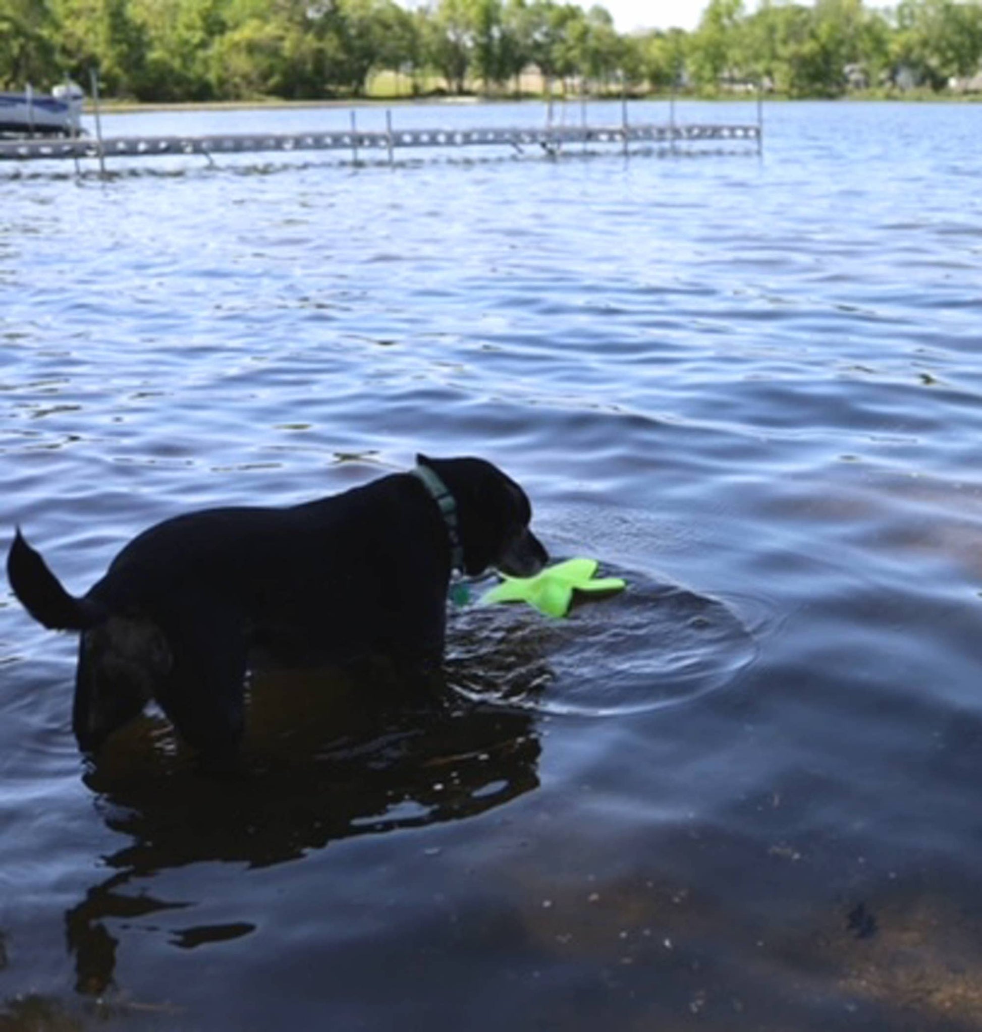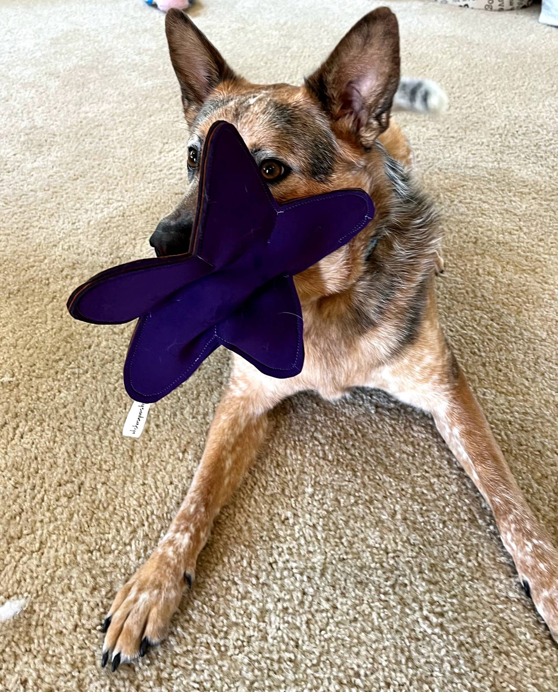 Fun unique handmade Dog Toy for indoor or outside use, great for pool, lake or ocean play time, toss it, play tug-a-war, your dog can play alone with toy or use as an interactive toy, toy is 10" wide and has a small tennis ball sewn inside. I use a soft yet very durable brightly colored Double-Faced Neoprene/Scuba Fabric on both sides of this toy. I named this toy after my dog Scoutie who loved to swim in his pool with toys that floated.
