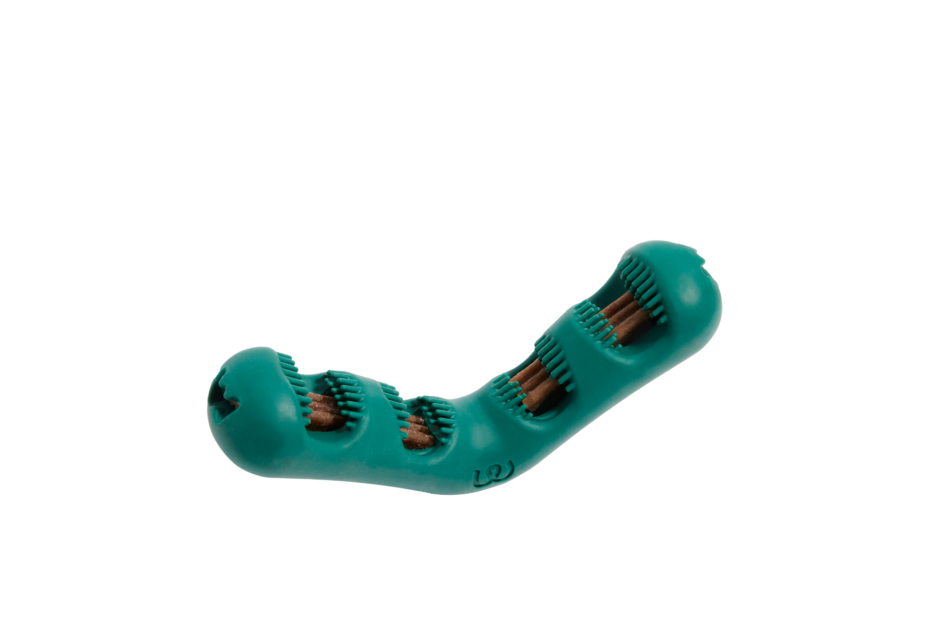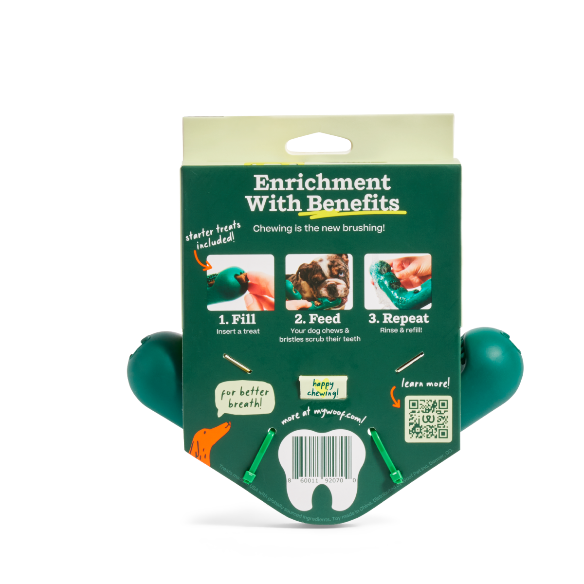 The V-shaped design of the Bite n’ Brush lets dogs brush their own teeth with special bristles sized just right to scrub plaque and tartar from all sides of the teeth and mouth. Simply add in our Dental Refill Treats—packed with scientifically-backed ingredients that support oral health like peppermint, parsley, and kelp—and let your dog chew away!